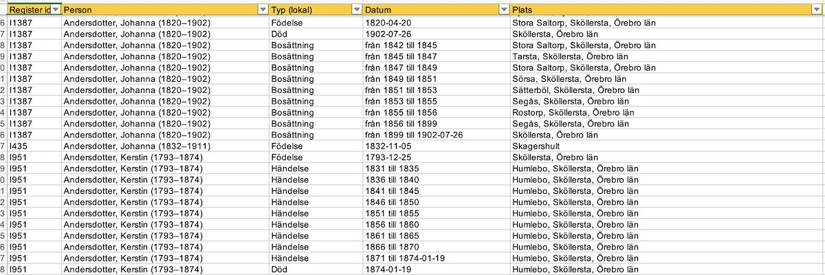 Lite pyssel att få till just Excelfilen med Personer och Platser från Genney registerutdrag komplett med platsernas koordinater.