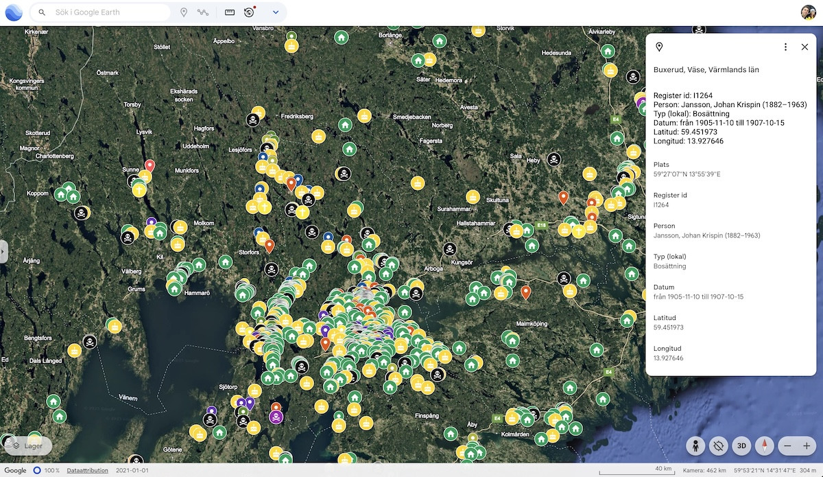 Det är ju fortfarande så att mycket info följer med i kartpositionerna till Google Earth men kopplingen till databasen och Genneyweb är fortfarande manuell, dvs jag måste såklart titta i Genney hur släktskapet är med exempelvis Johan Krispin Jansson, bosatt i Boxerud 1905-1907.