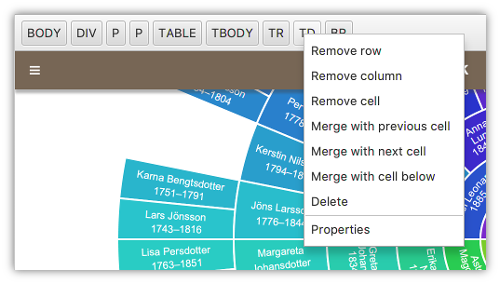 Inserts a fan chart with six generations ancestors to the root person. A root person is required for the feature to be available. |