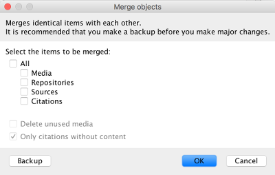 Tool to merge identical objects (sources, citations, repositories and media). Open the tool with the above command.