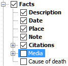 Displays Content for persons and family where you can specify the content of the family and different individual types: main person, parents, children, etc. There are two tabs for each type: Tasks where you choose what to include by checking areas of the tree structure and Facts where you choose which fact types to be included.