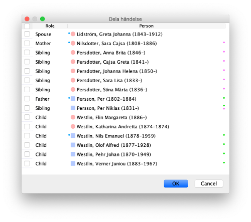 Share event opens a window with family members where you can choose which persons you want to share the event with. Event types that cannot be shared are family events, births and deaths.