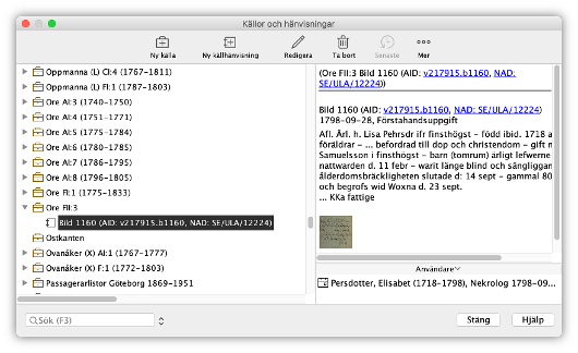 I trädet till vänster i fönstret är alla källor ordnade i bokstavsordning och under varje källa finns alla hänvisningar till den källan. Om använd utökade källhänvisningsalternativ är ikryssad visas även källhänvisningar som inte innehåller data. När du markerar ett objekt i trädet visas information om objektet och/eller användaren i fönstrets högra del.