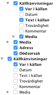 För varje roll finns ett träd där man kan markera vilka uppgifter som ska ingå i utskriften. Det finns två källhänvisningar i varje träd: en för faktauppgifter och en för rollen (person eller familj). Vill man t.ex. att huvudpersonens händelsers källhänvisningar ska innehålla bilder markerar man huvudpersonen och kryssar för media för källhänvisningar under faktauppgifter.