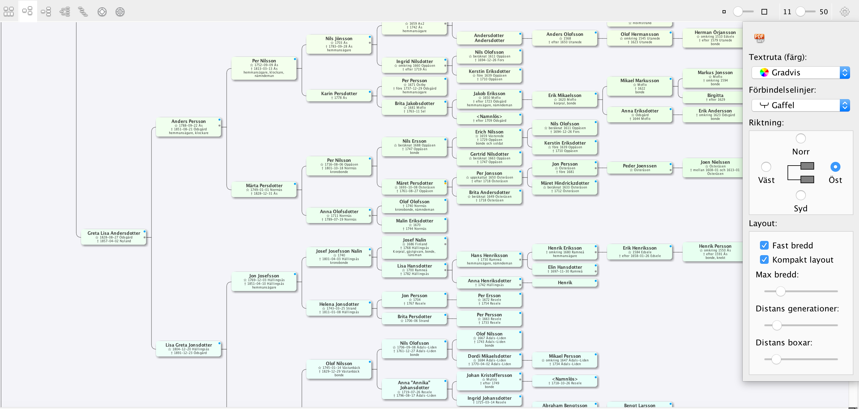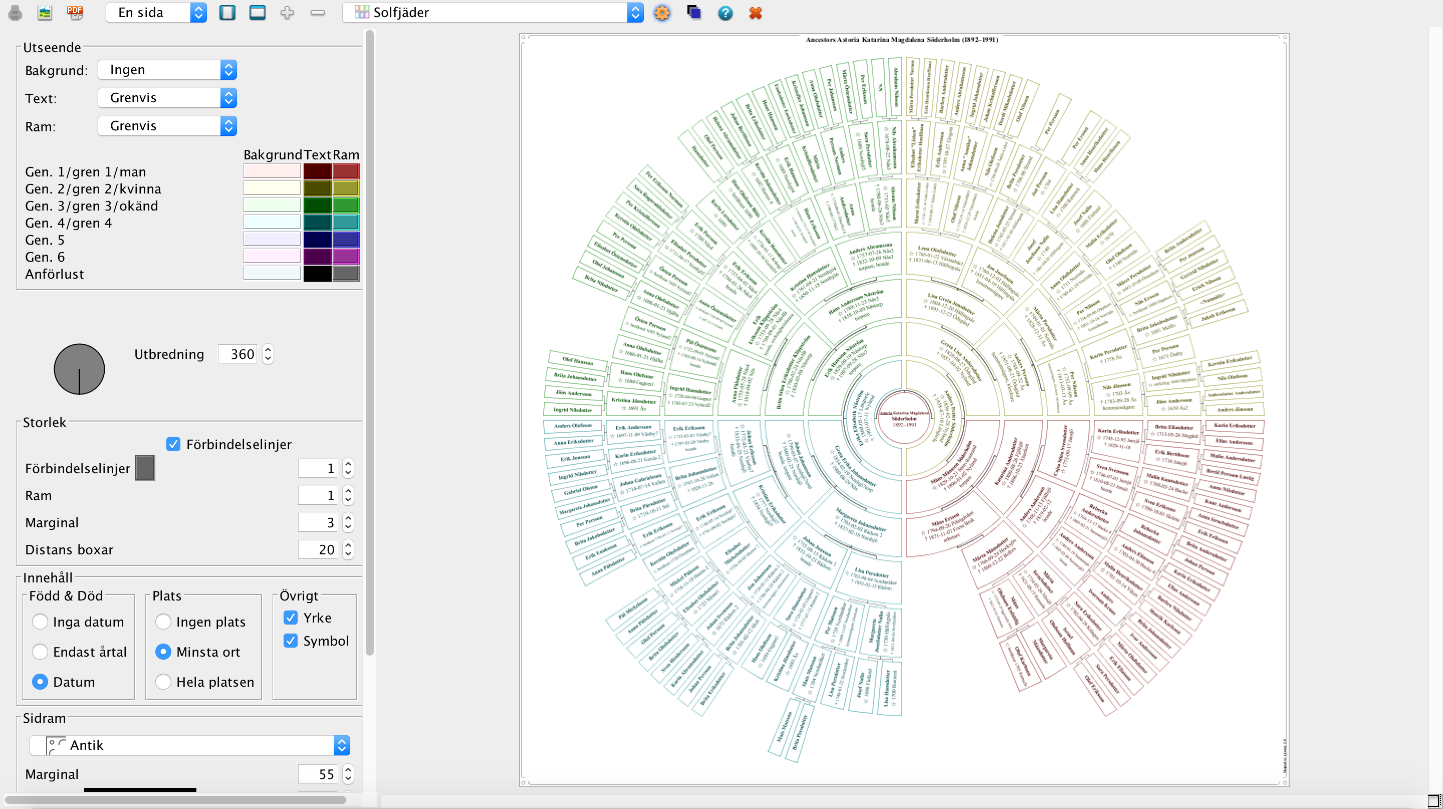 Du ändrar inställningar för utskrifter av planscher och cirkeldiagram genom att klicka på det gula kugghjulet i förhandsgranskningen av utskriften. Och om du håller shift nedtryckt när du ändrar färg för bakgrund, text eller ram så ändras alla generationerna till den färgen.
