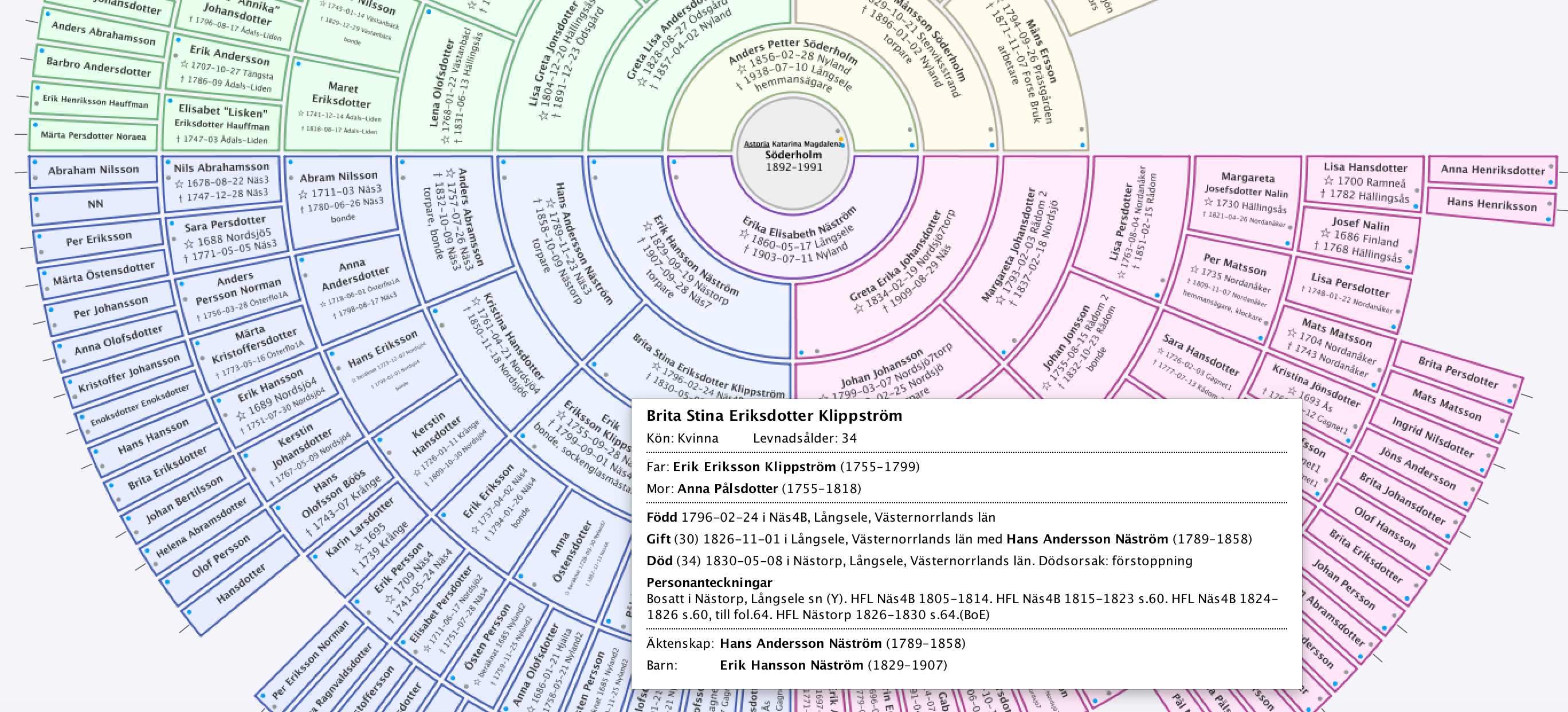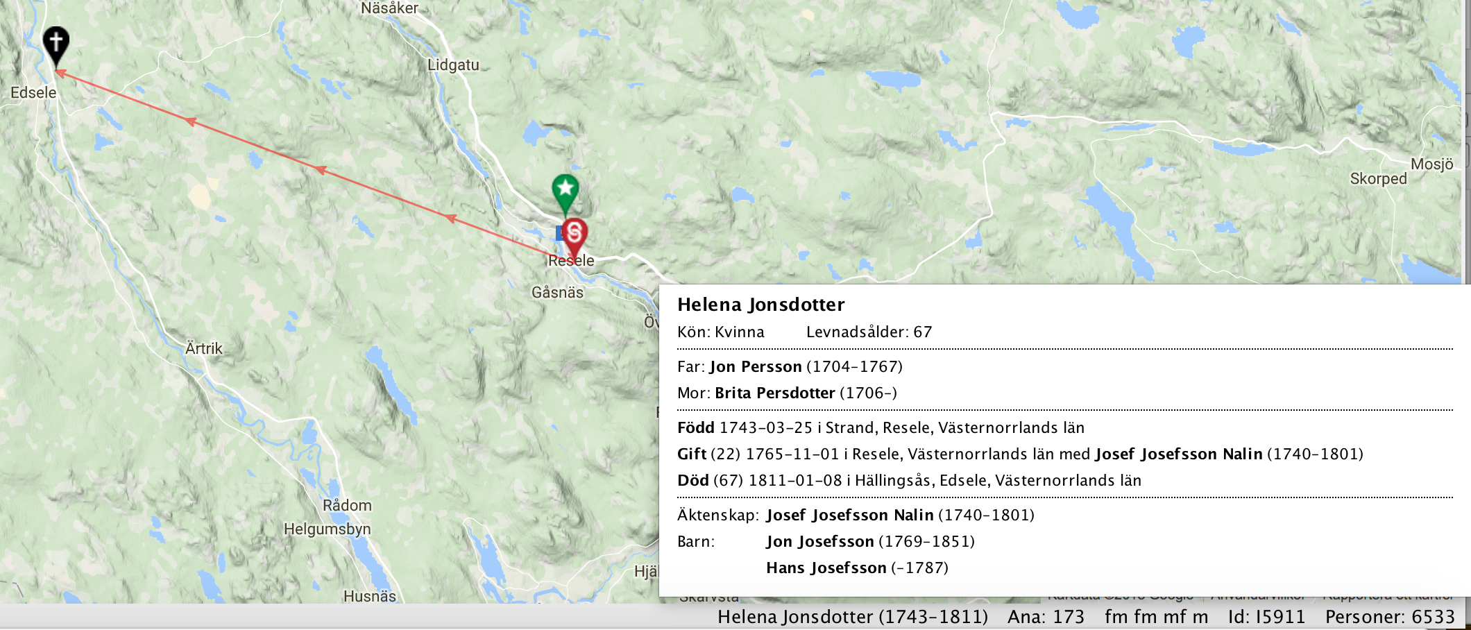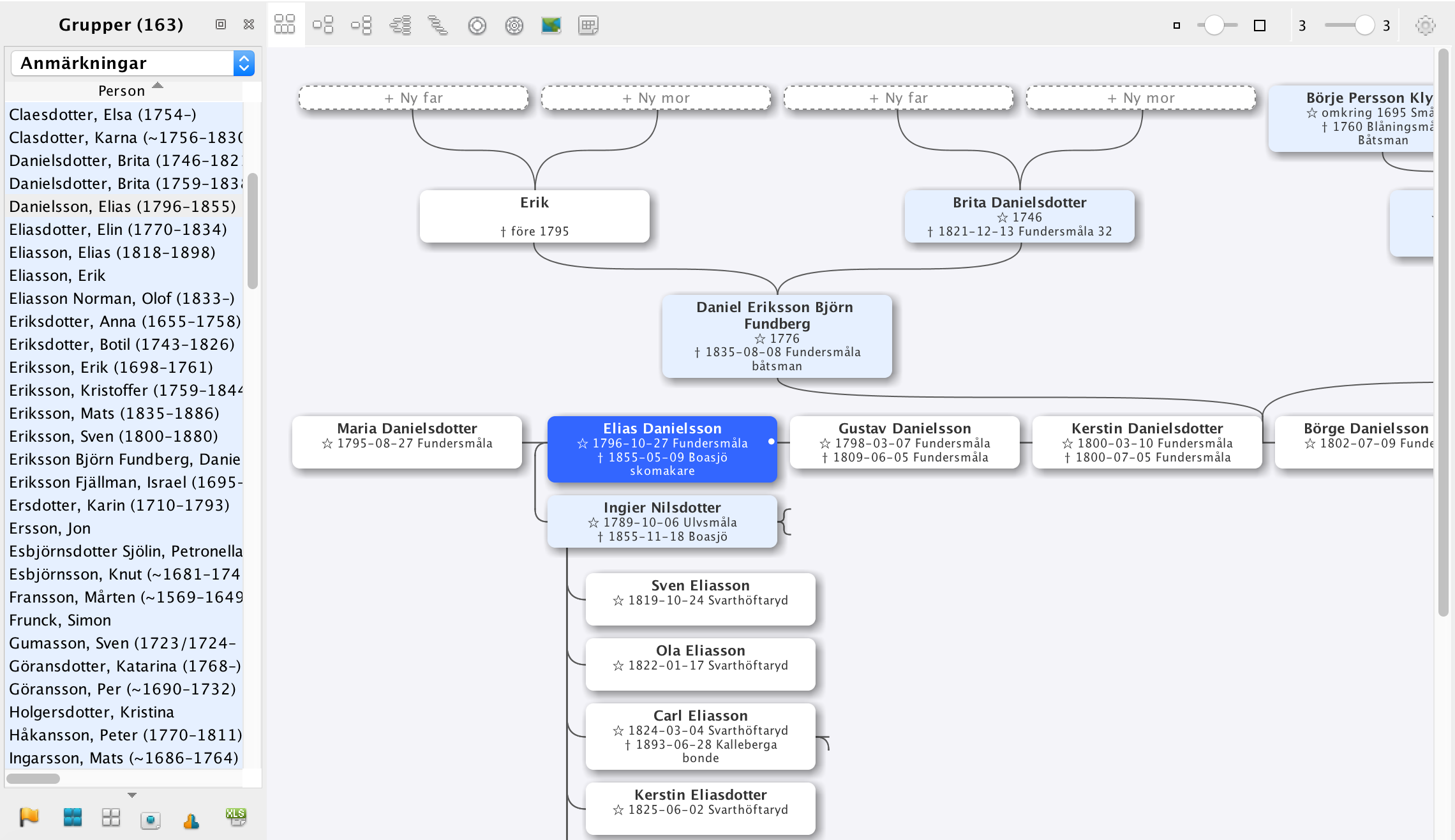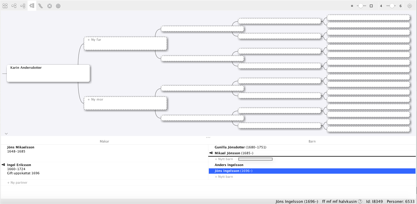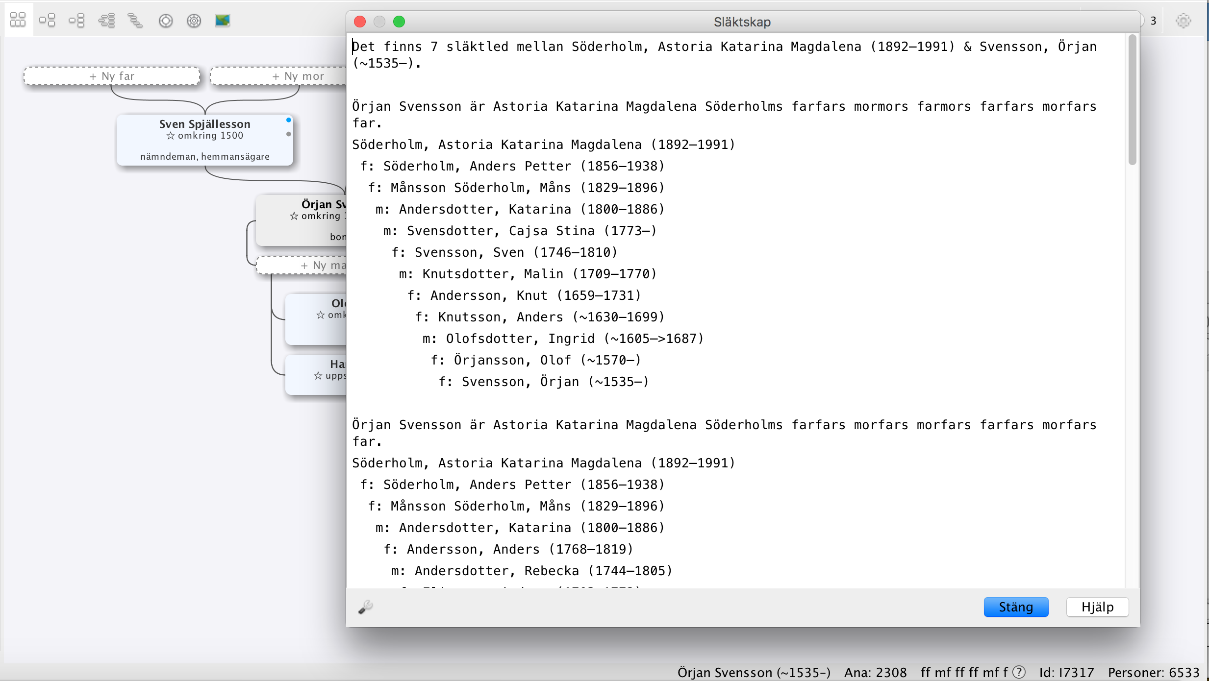 Om man klickar på släktskapet i statusraden visas släktskapet utförlig och om det är ett frågetecken efter släktskapet betyder det att probanden har flera släktled med den markerade personen.