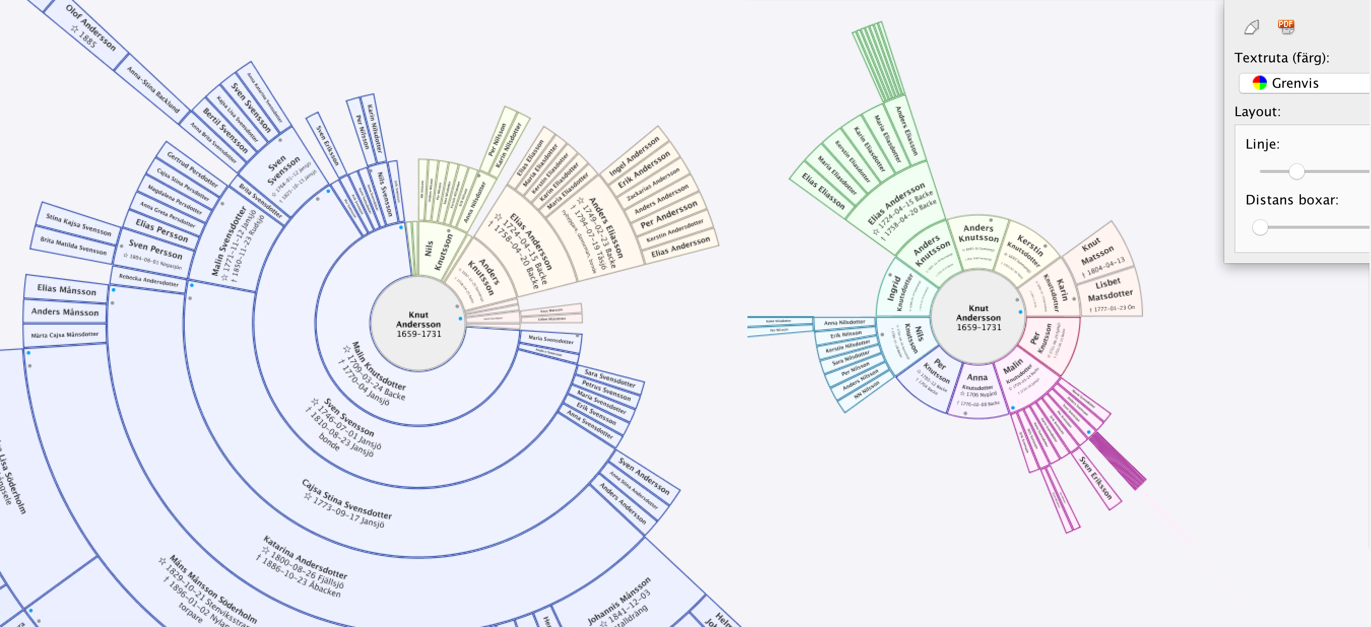 Det finns två olika layouttyper för cirkeldiagrammen. En där varje generations barn får lika stor del av cirkeln och en där de ättlingar som är flest får större del av cirkeln. Man ändrar under inställningar för vyn.