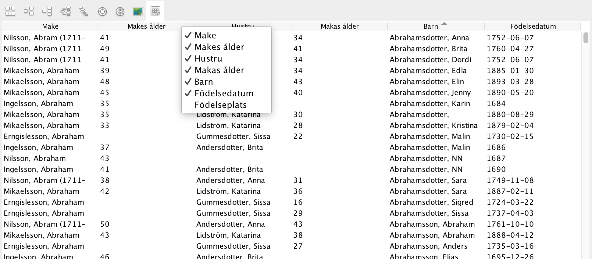Det går att välja vilka kolumner som visas i registerutdragen genom att högerklicka på kolumnhuvudet.