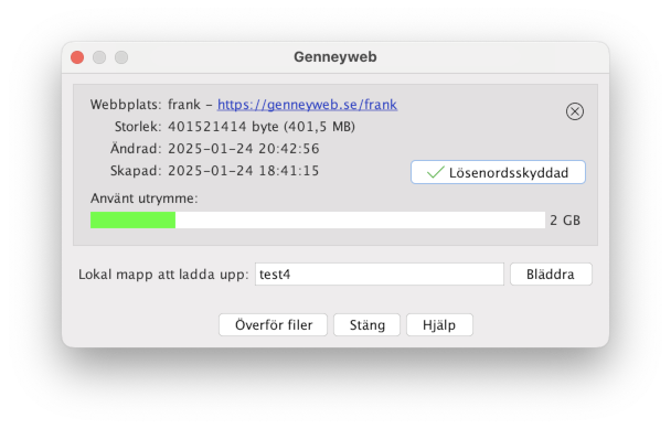 När du har skapat ditt kontonamn får du möjlighet att lägga upp din publicering. Välj Bläddra och leta upp mappen med samma namn som titeln som du nyss skapade och välj Överför filer. Genney kommer att ladda upp dina filer till internet vilket kan ta ett tag så se till att du är uppkopplad medan förloppsindikatorn visas. När filerna laddats upp bör du lösenordsskydda sidan (klicka på Lösenordsskyddad) om den faller under GDPR