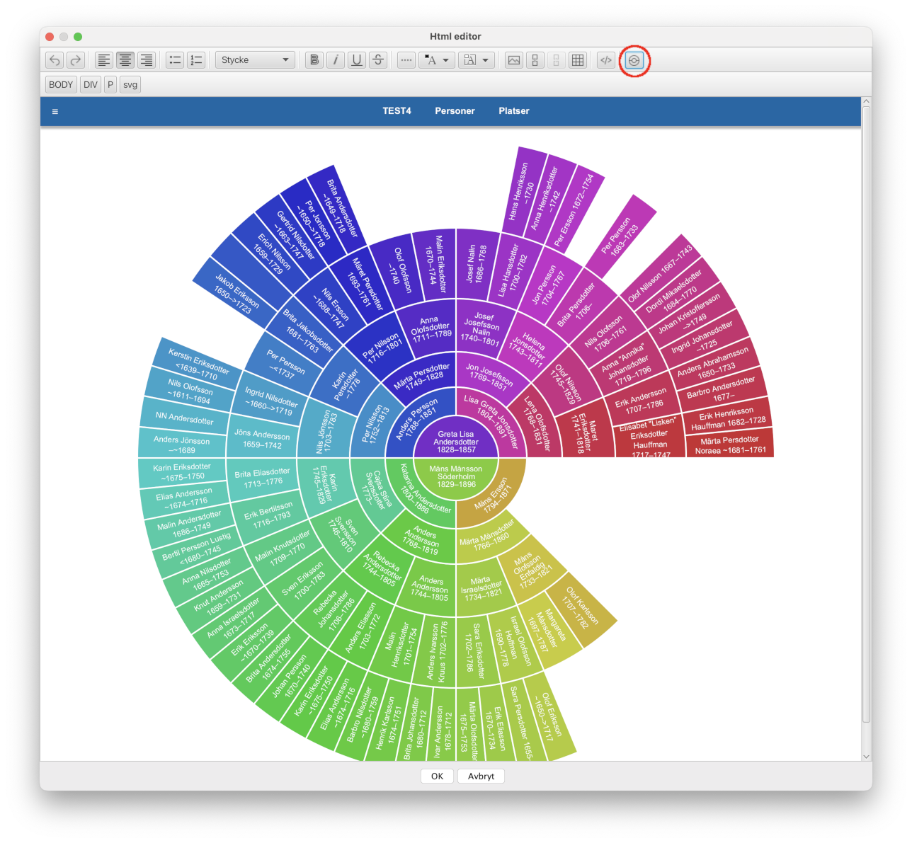 Ett enkelt alternativ till eget innehåll på startsidan är att bara infoga ett klickbart cirkeldiagram. För att göra det krävs att du har valt en proband/startperson vilken är den person som cirkeldiagrammet utgår ifrån.
