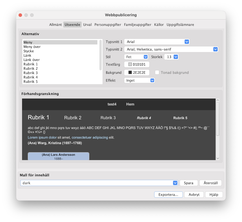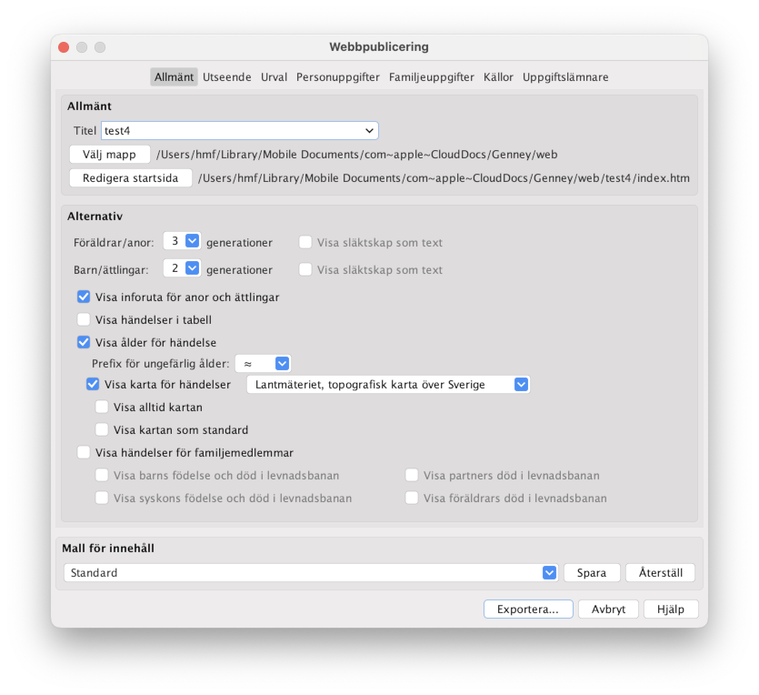 Förutom de alternativ som visas på den första fliken Allmänt bestämmer du vilket innehåll som ska komma med under flikarna Personuppgifter, Familjeuppgifter och Källor. Under fliken Urval väljer du vilka personer som ska ingå i publiceringen och under uppgiftslämnare vilka uppgifter om dig själv som ska visas.